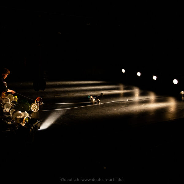 Verschiedene Teller, zusammengeschraubt wie Diabolos, rollen, kullern, poltern von rechts nach links über die Bühne. Jeder Teller könnte eine Figur sein, ein Charakter, er könnte eine Geschichte erzählen, eine clowneske oder eine tragische.